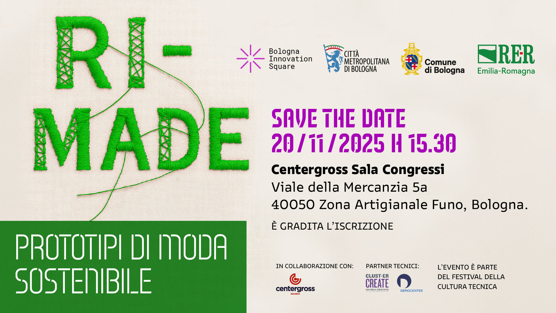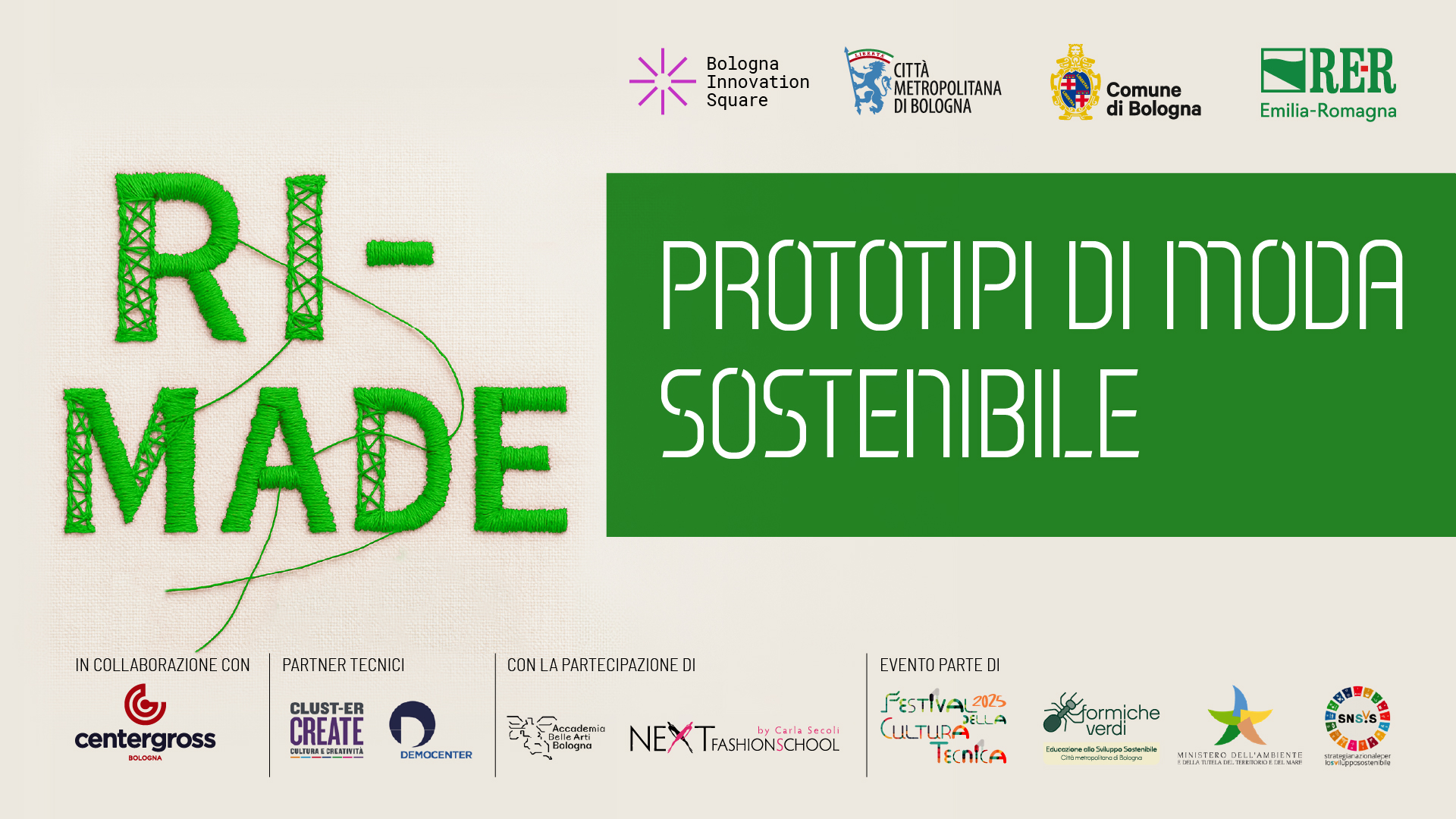 Il distretto moda di Bologna si prepara a un nuovo appuntamento dedicato all’innovazione sostenibile: RI-MADE – Prototipi di Moda Sostenibile, l’evento promosso da Bologna Innovation Square (BIS), di Città metropolitana di Bologna e del Comune di Bologna, in collaborazione con Centergross e con il supporto della Regione Emilia-Romagna.